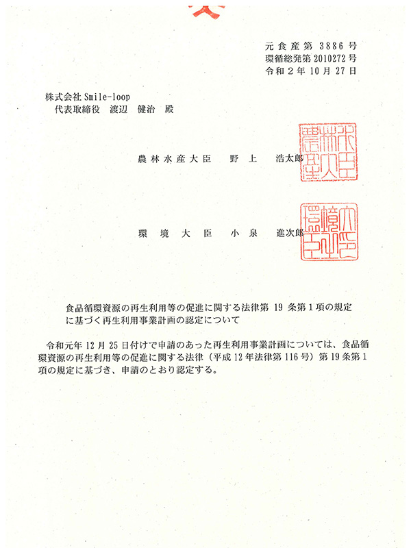野菜は生産者(Smile-loop)にて安全で安心な作物を育て出荷。食品加工業者で野菜をカットした際に出てきた野菜のくずを再生利用業者(トマウェーブ)でメタン発酵をさせ肥料とエネルギー(電気)へと変えるこの流れを食品リサイクルループといい、この取り組みを通じて持続可能な農業を目指しています。